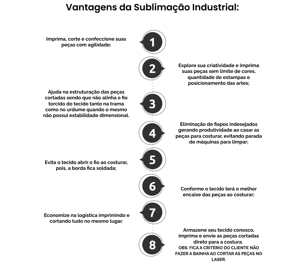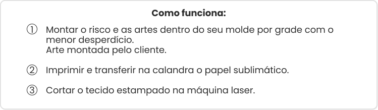 Com o nosso serviço de Sublimação Industrial você personaliza suas peças com desenhos localizados ou full print montados e estampados em metro corrido, dentro do risco de corte e cortados a laser.